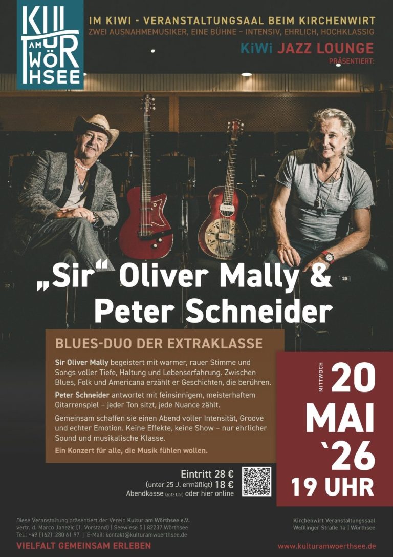 Zwei akustische Gitarren, eine Mundharmonika und die raue, kraftvolle Stimme von „Sir“ Oliver Mally – das sind die Zutaten für ein beeindruckendes musikalisches Erlebnis, das die beiden Bluesexperten ihrem Publikum bieten. In ihrer einzigartigen Kombination schaffen es Mally & Schneider, die Zuhörer von der ersten Note an in ihren Bann zu ziehen und mit ihrer Musik zu begeistern. Mally ist ein genialer Geschichtenerzähler, der in seinen Songs mit warmer, sonorer Stimme den Zuhörer in seine wilde Blueswelt entführt und sich raffiniert an der Gitarre begleitet. Was Peter Schneider wie beiläufig von den Gitarrensaiten pflückt, ist ein besonderer Genuss. In jedem Ton ist die Klasse des Münchner Gitarristen zu hören! Die Chemie zwischen Mally und Schneider ist faszinierend, und ihre musikalische Interaktion auf der Bühne ist ein Genuss für die Sinne.