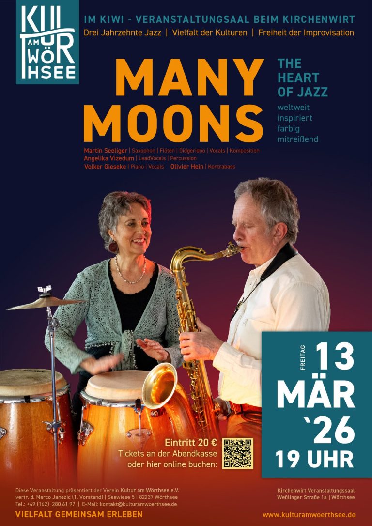 Der Kulturverein „Kultur am Wörthsee“ lädt am Freitag, den 13. März, zu einem besonderen Konzerterlebnis ein. Ab 19:00 Uhr verwandelt das Jazz-Quartett Many Moons den Veranstaltungssaal „KiWi“ beim Kirchenwirt in eine stimmungsvolle Jazzlounge.